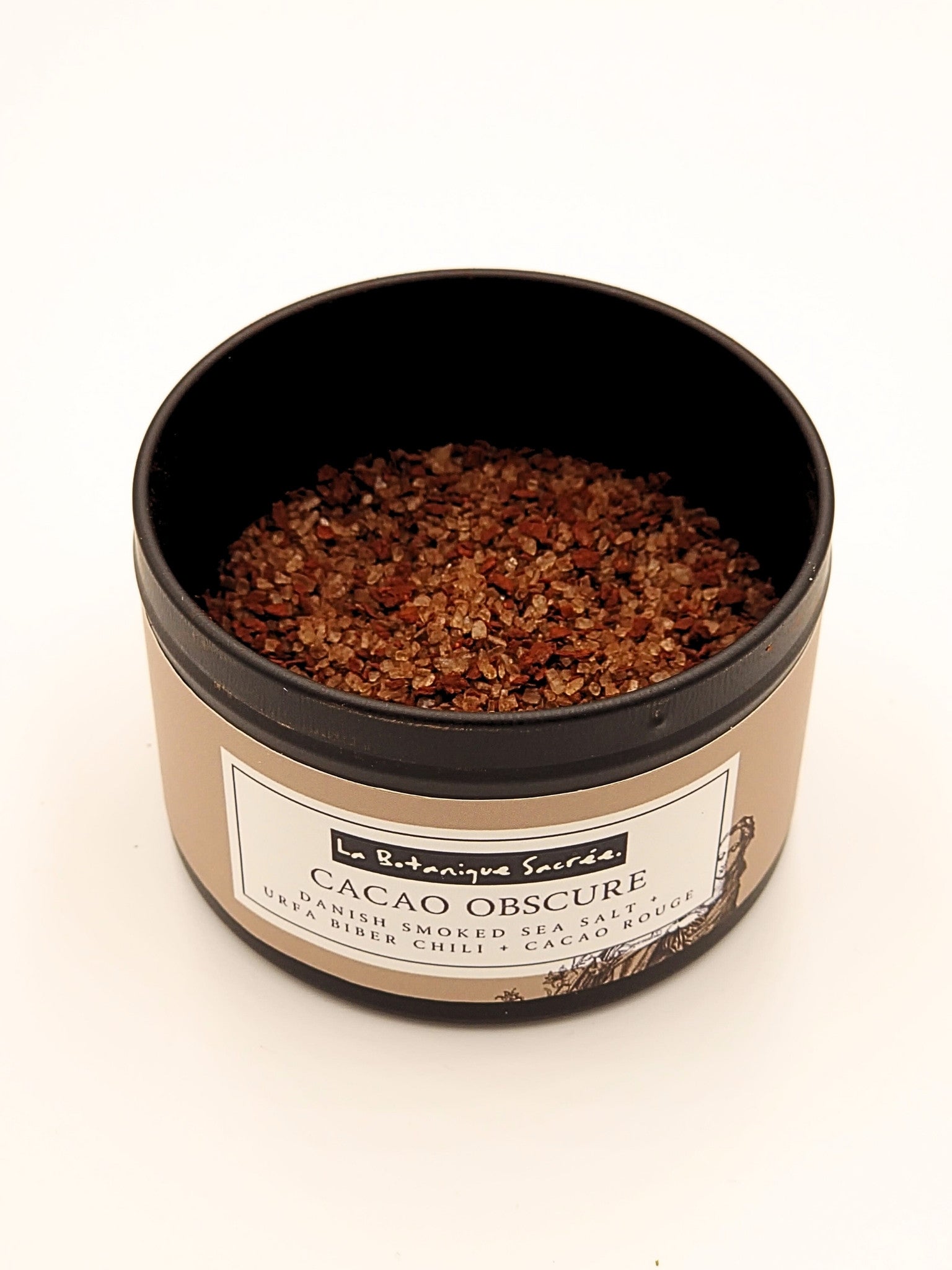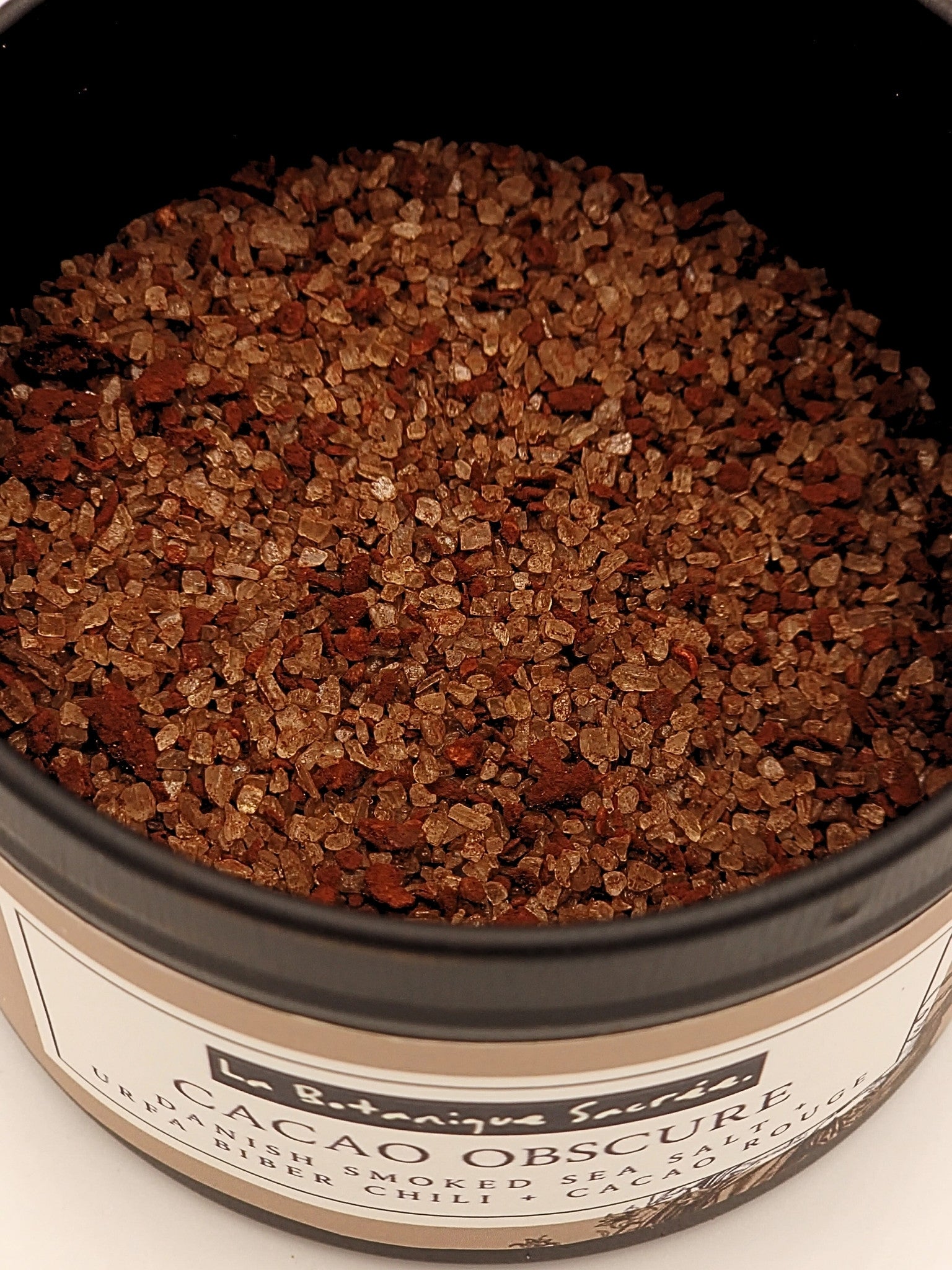 A smoked salt blend crafted with Danish beechwood salt, Urfa Biber chili, and Belgian Callebaut Rouge Ultime cacao. It delivers smoky depth, raisin-like heat, and bittersweet chocolate richness.