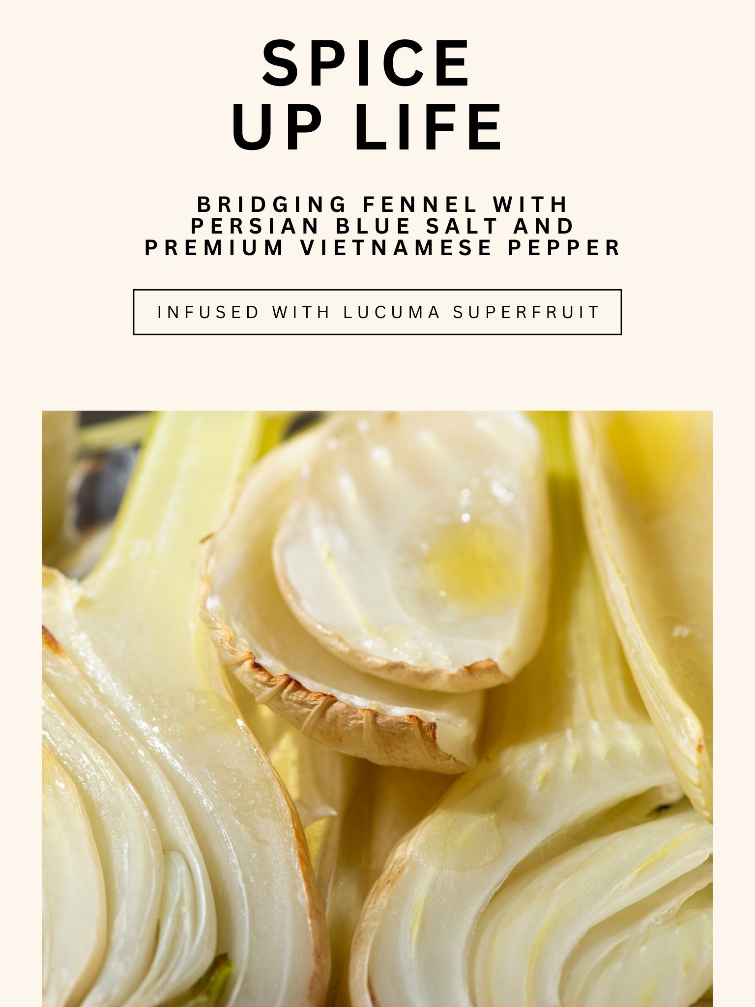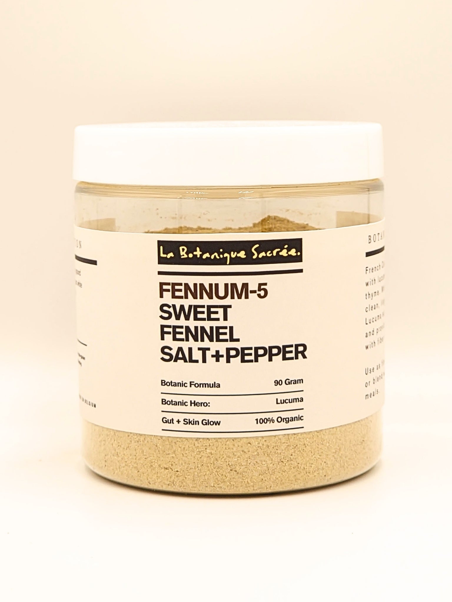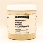 Persian blue salt 65%, lucuma, ground fennel, Phu Quoc white pepper, and ground thyme. Flavor reads mineral, aniseed-green, gentle caramel, and a light pepper prickle.