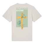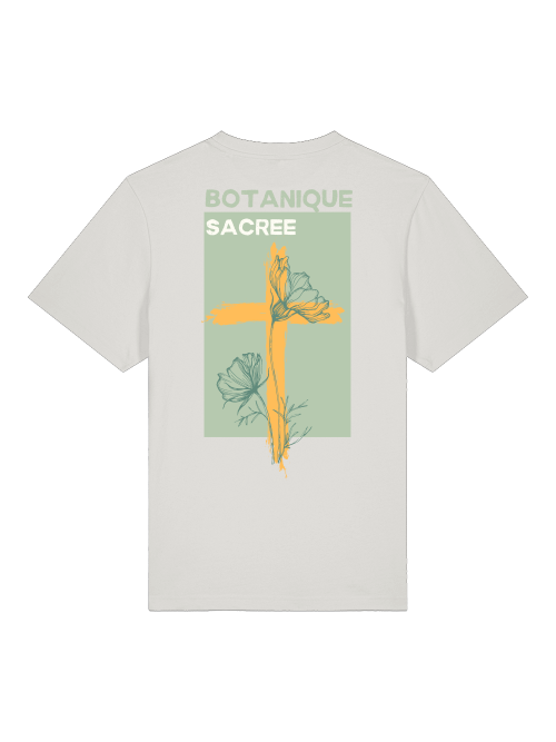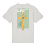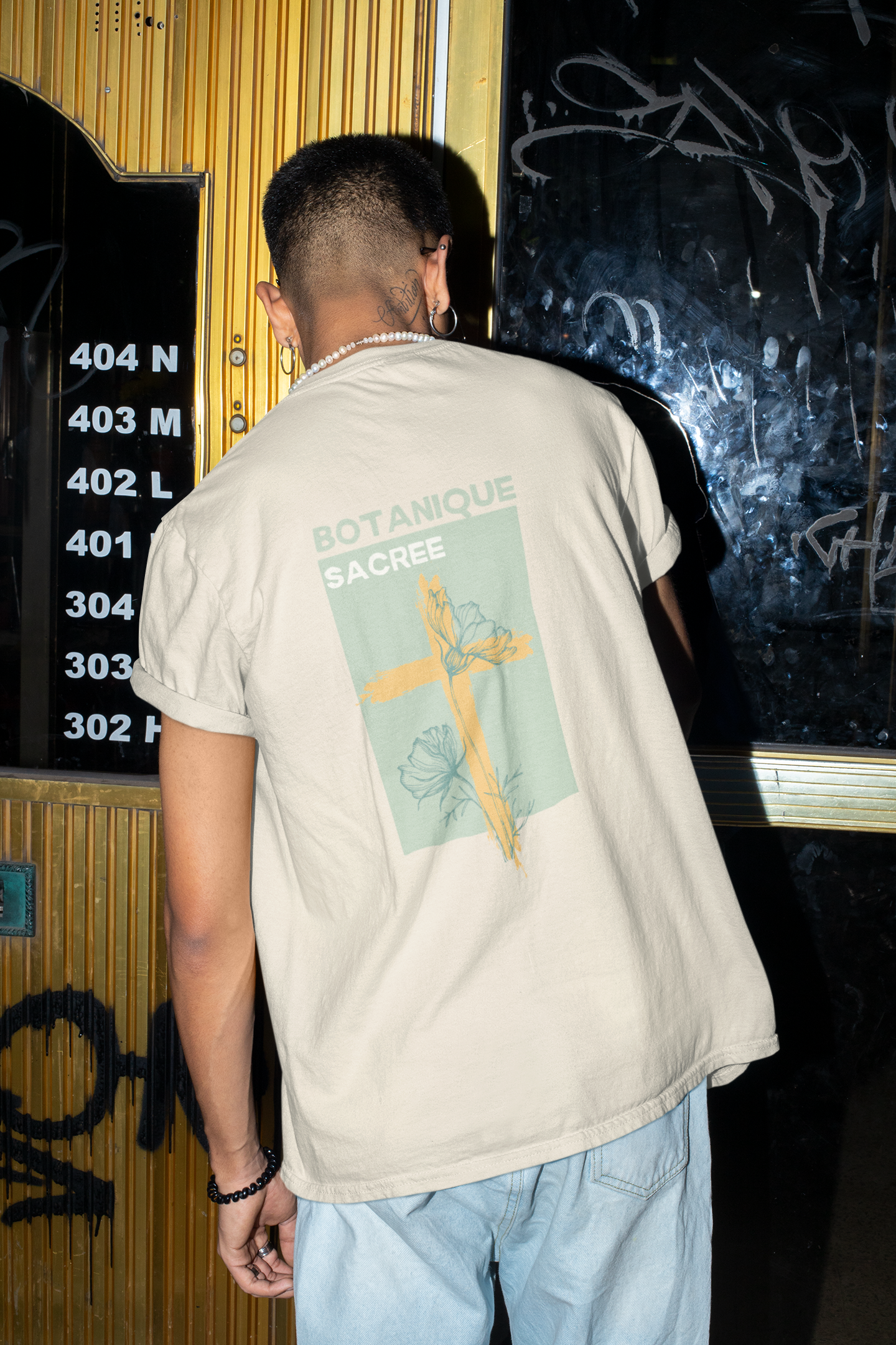 La Botanique Sacrée extends its ritual of botanical precision to cloth. The house logo appears on a relaxed-fit tee cut from 215 gsm single-jersey, 100 percent GOTS-certified organic carded cotton. The fabric holds a clean drape, resists twisting, and remains gentle on skin thanks to combed yarns and the absence of chemical finishes