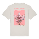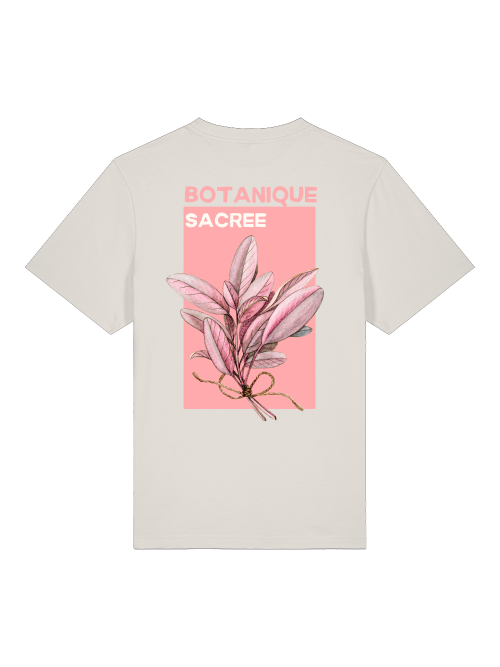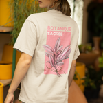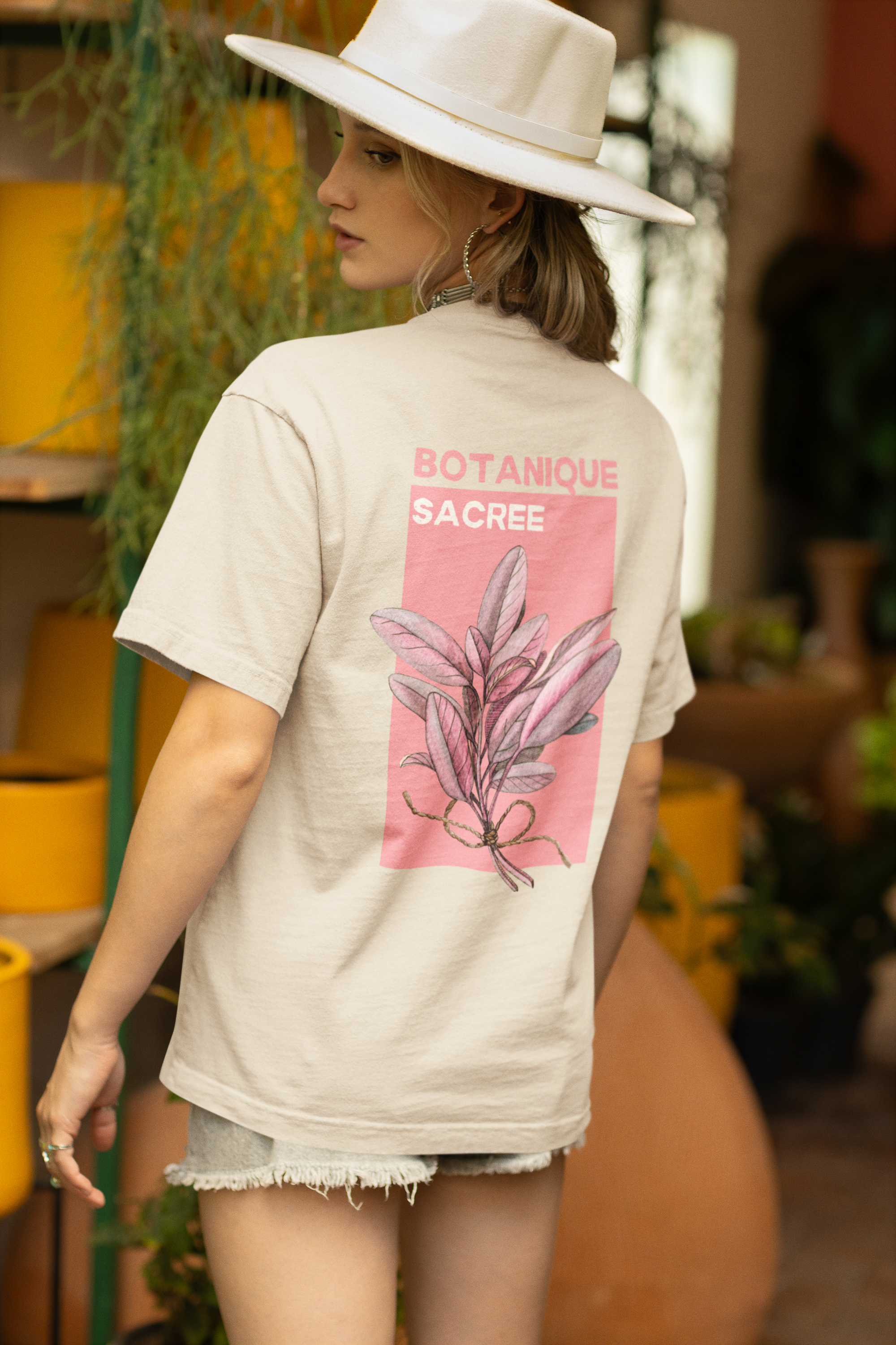 La Botanique Sacrée extends its ritual of botanical precision to cloth. The house logo appears on a relaxed-fit tee cut from 215 gsm single-jersey, 100 percent GOTS-certified organic carded cotton. The fabric holds a clean drape, resists twisting, and remains gentle on skin thanks to combed yarns and the absence of chemical finishes