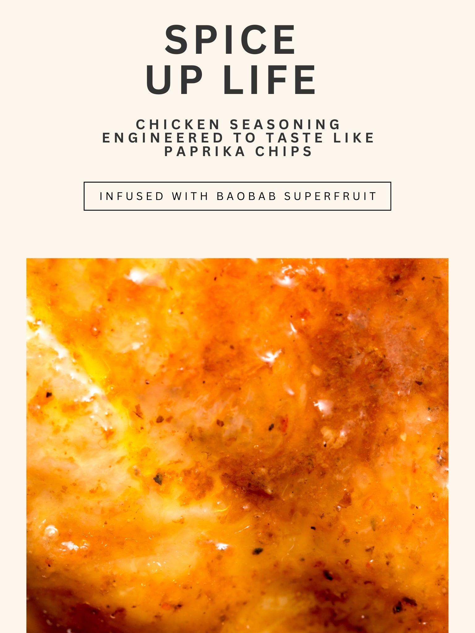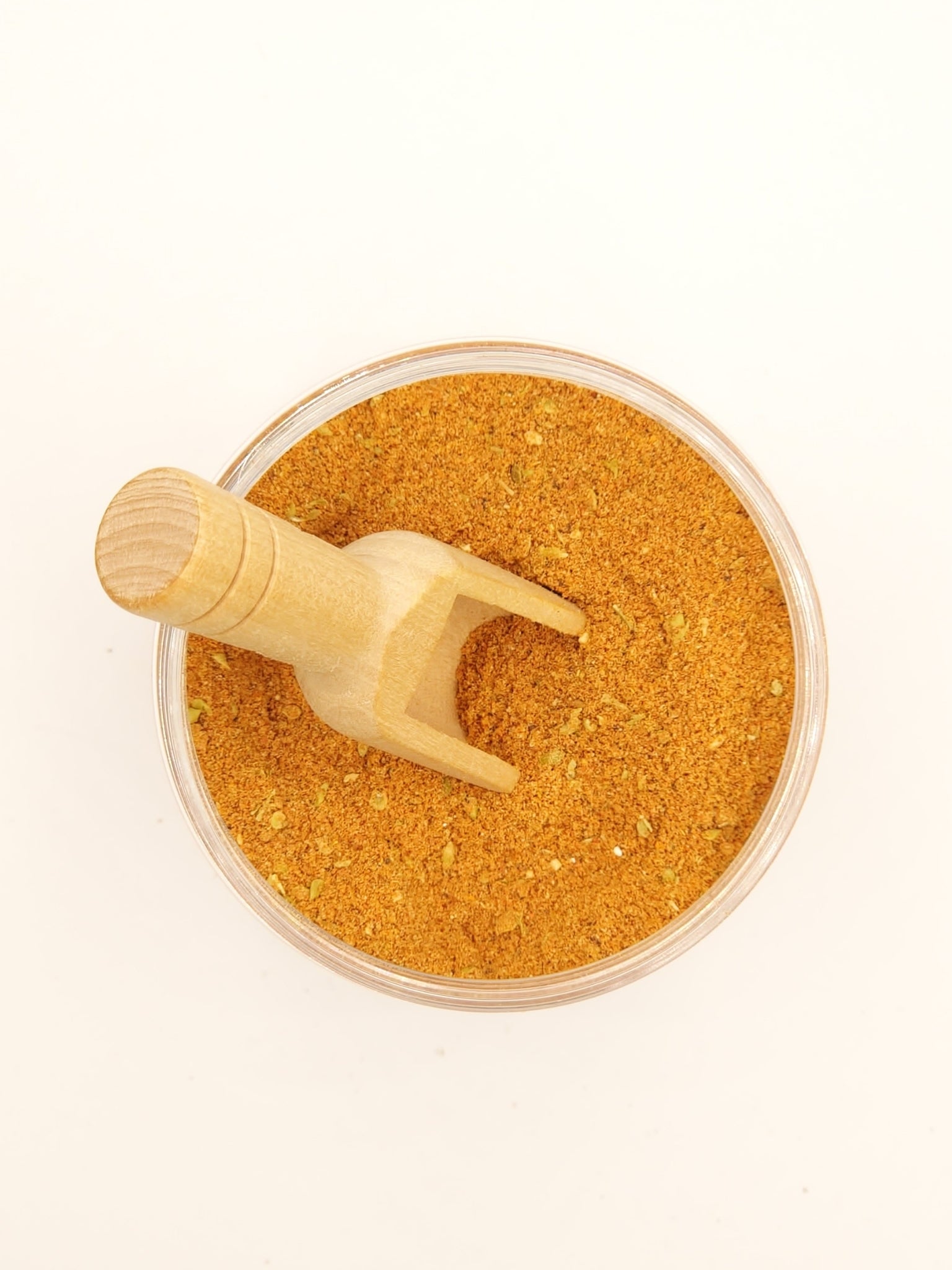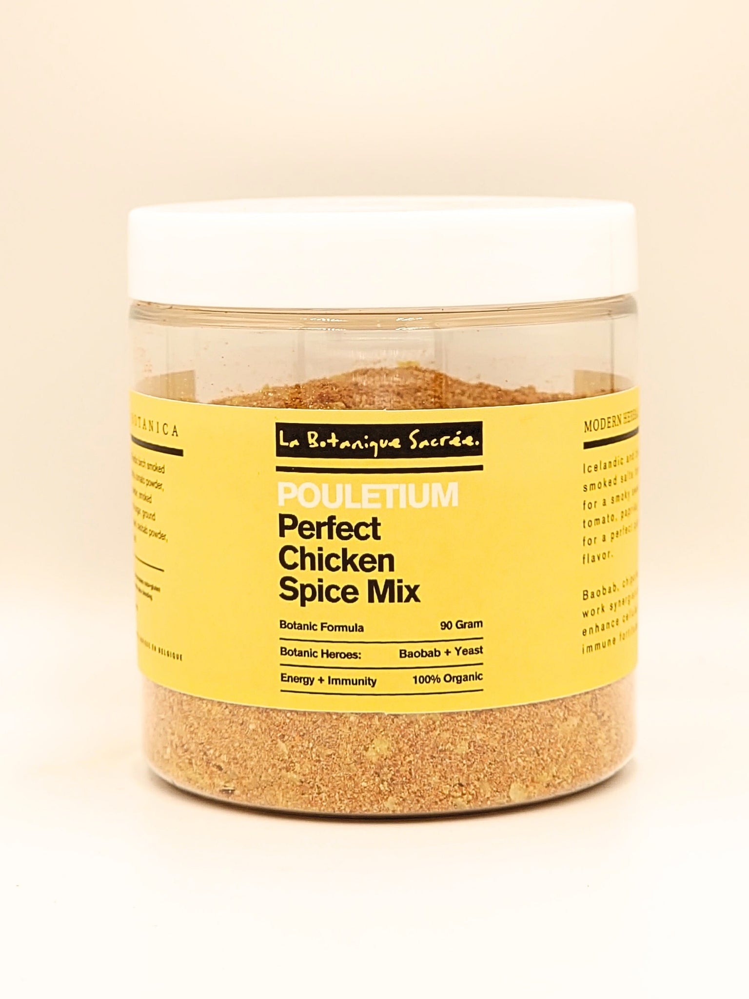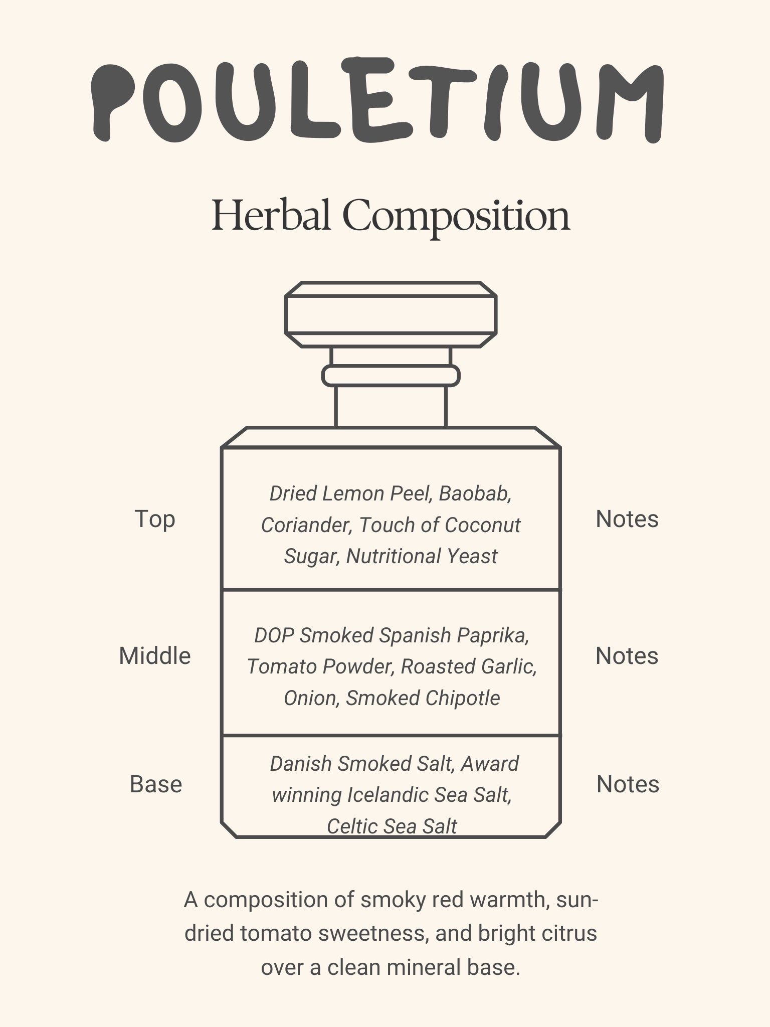 Pouletium is our Nordic ode to charcoal nights and crackling skin. Birch-smoked paprika lays a ruby foundation. Coriander and baobab brighten the middle with citrus-nut clarity. Nutritional yeast and low GI coconut sugar seal everything beneath a savoury crust that snaps at first bite. The blend clings to poultry like a dry glaze, colouring the surface deep scarlet while releasing faint campfire aromatics.