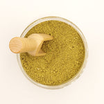 Golden flaxseed meal softens structure and rounds texture, while moringa leaf powder adds green freshness and nutrient density. Together they enrich body and function.