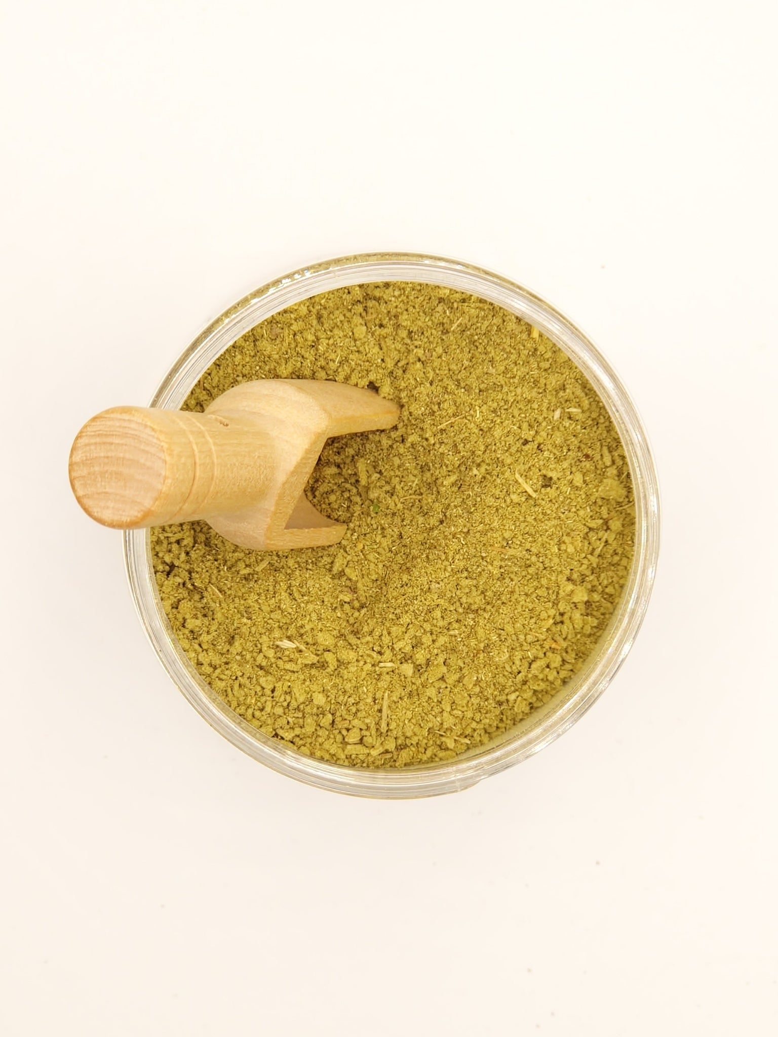 Keep airtight, cool, and away from light. Fine rub with light leaf flecks. Natural product without anti-caking agents; keep utensils dry to maintain free flow.