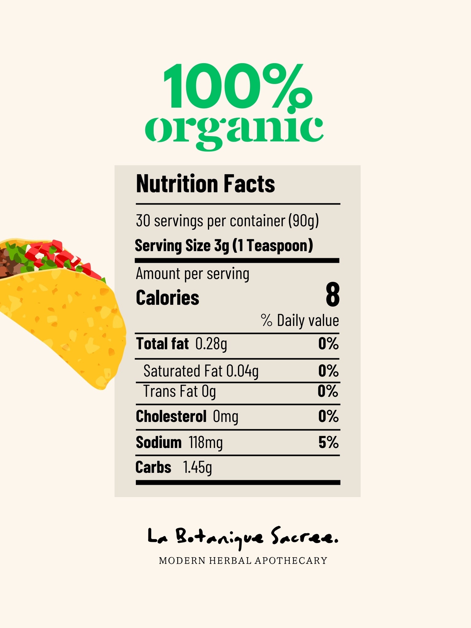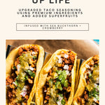 Contains mineral salt for proper bloom. No added sugar. Plant-only composition. Formulated without gluten-containing ingredients. This taco seasoning spice blend is designed for clean, filler-free cooking.